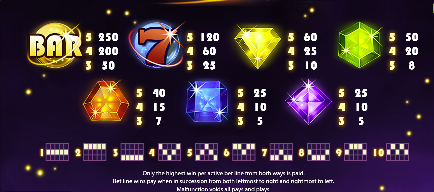 • Gem symbols (various colours) lower-to-mid payouts depending on alignment.