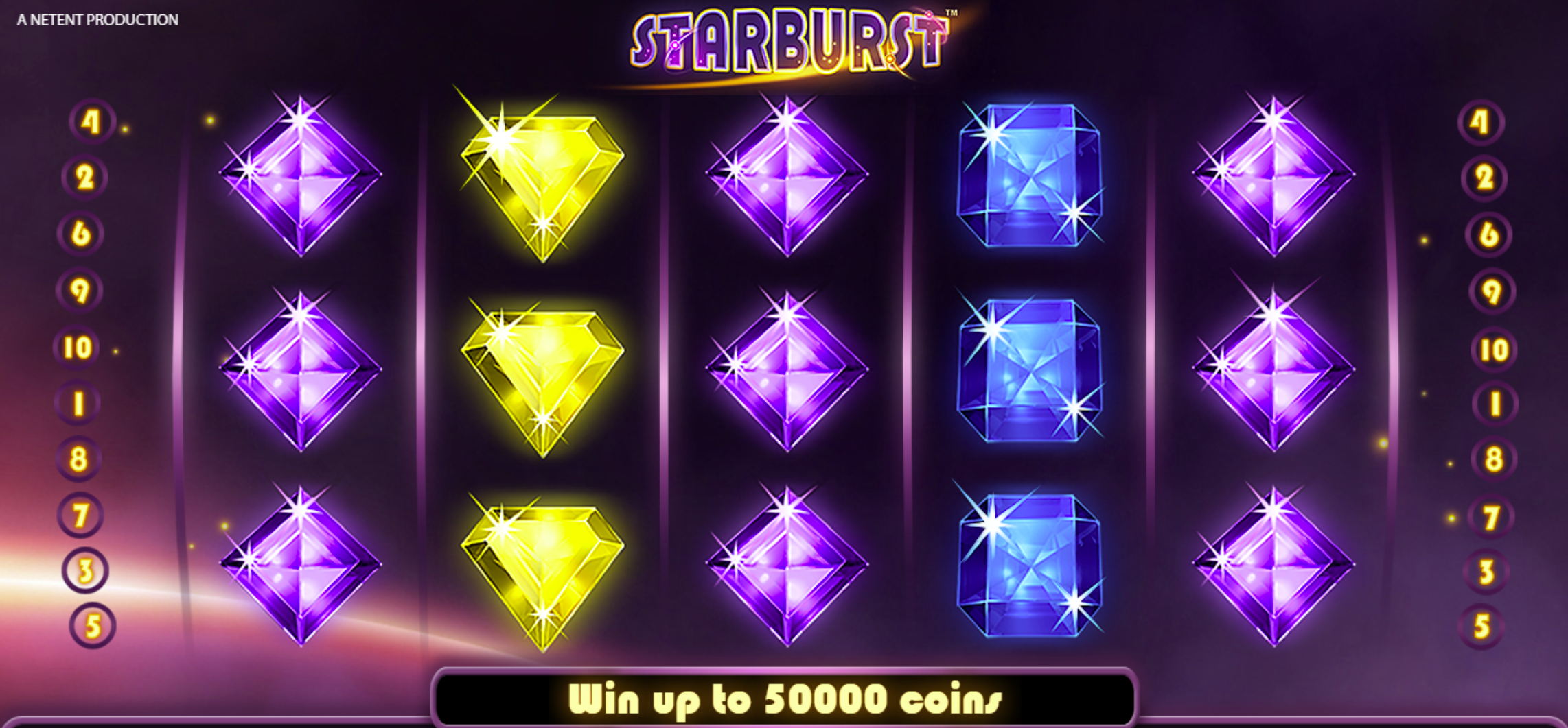 • Starburst Wild expands to full reel and triggers re-spin, substitutes for all other symbols.